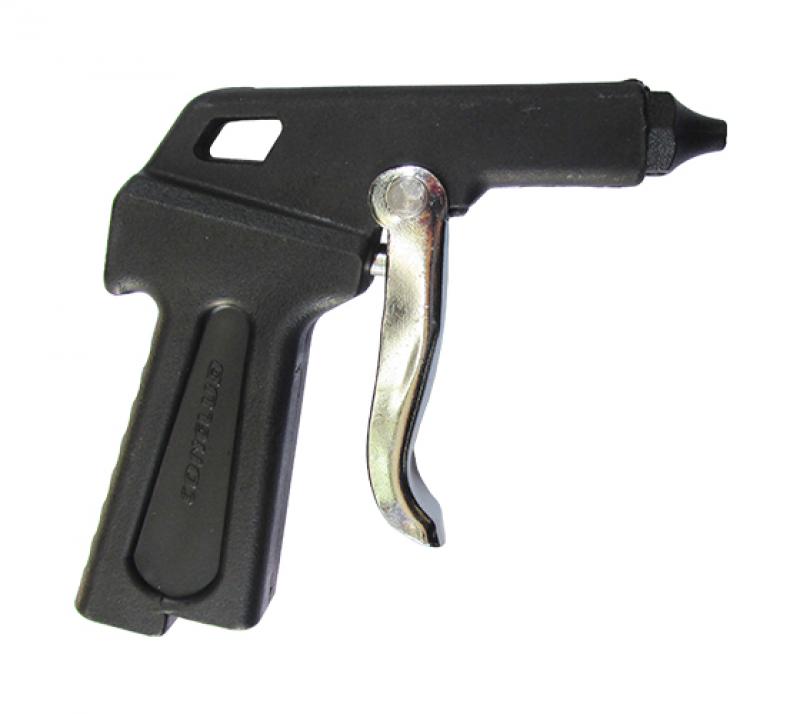 Pistola de ar fabricada em material resistente, com corpo e inserto em Nylon e gatilho em metal